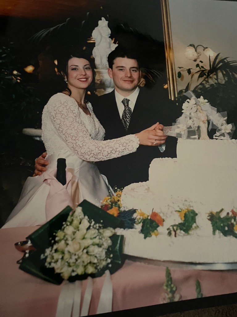 On January 18, 1997, the much-anticipated day finally arrived – their wedding day! Mamma, at a tender age of 21, and Babbo, a mere 26, were both youthful and deeply in love, fervently yearning for each other with unbridled passion. Mamma’s gown, meticulously crafted from Ivory Mikado and adorned with exquisite Italian lace on the top half, was nothing short of breathtaking. She always reminisced about how her father, Nonno, had adamantly urged her to wear white instead of ivory, yet with unwavering resolve, she fearlessly pursued her heart’s desire.